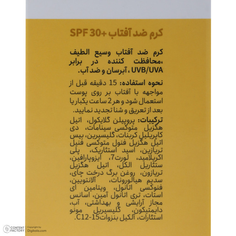 کرم ضد آفتاب بدون رنگ سیلکِر +SPF 30 مدل sun protect، حاوی مواد مفید و مورد نیاز پوست است و با +SPF 30 از پوست صورت در مقابل اشعه مضر آفتاب محافظت میکند. این کرم محافظ در برابر اشعههای UVB/UVA است و علاوه بر آن خواص آبرسانی و نرمکنندگی دارد. این کرم ضد آب بوده و کاربرد زیادی برای انواع فعالیتهای روزانه، ورزش و استخر دارد. حجم 50 میلیلیتر و بسته بندی سبک مناسب حمل کردن در کیف است و میتوان همیشه همراه شما باشد. قبل از قرار گیری در معرض نور مستقیم خورشید (15 دقیقه قبل) بر روی پوست استعمال شود و هر 2 ساعت یک بار، بعد از تعریق و شنا تمدید نمایید. این کرم برای انواع پوست مناسب است و محدودیت استفاده ندارد و همچنین برای پوست صورت و بدن قابل استفاده است.