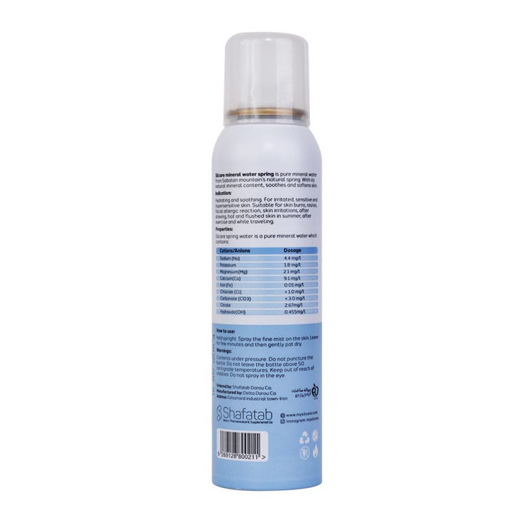 اسپری آب سیلکر تهیه شده از چشمه های طبیعی کوه سبلان است که حاوی مواد معدنی بوده و با فشار گاز ریزپاش شده و از سطح لایه شاخی پوست عبور کرده و میزان آبرسانی را به پوست افزایش می دهد و لطیف می کند،با توجه به این مسئله که آبرسانی برای حفظ و سلامت پوست ما بسیار با اهمیت بوده به خصوص در تابستان با توجه به گرمای هوا که میزان تبخیر آب پوست بیشتر شده و چه در زمستان که خشکی هوا میزان آب درون پوست را کاهش می دهد اسپری آب معدنی سیلکر کمک شایانی به ما می کند. موارد مصرف: اسپری آب معدنی سیلکر جهت استفاده برای آبرسانی روزانه پوست برای پوست تحریک شده ،حساس و بیش از حد حساس مناسب برای سوختگی های پوستی، بثورات پوستی واکنش آلرژیک صورت، تحریکات پوستی پس از اصلاح گرم شدن و بر افروختگی پوست در تابستان، بعد از ورزش و هنگام مسافرت بسیار مناسب بعد از کاشت مو و ابرو بوده که می تواند التهاب و سوزش و خارش بعد از کاشت را تسکین داده و به ترمیم سریعتر پوست کمک کند و بسیار مناسب برای گرگرفتگی های زمان یائسگی است. مواد تشکیل دهنده آسپری آب سیلکر شامل مواد معدنی و املاح موجود در آب معدنی از جمله منیزیم و کلسیم،سدیم، پتاسیم، منیزیم، کلسیم، آهن، نیترات، سولفات، کربنات و سیترات می باشد. نحوه مصرف روزانه به دفعات دلخواه میتوانید روی پوست خود اسپری کنید و برای تمام سنین حتی نوزادان قابل استفاده می باشد. در دمای محیط و دور از تابش مستقیم نور آفتاب و دور از دسترس کودکان نگهداری شود .