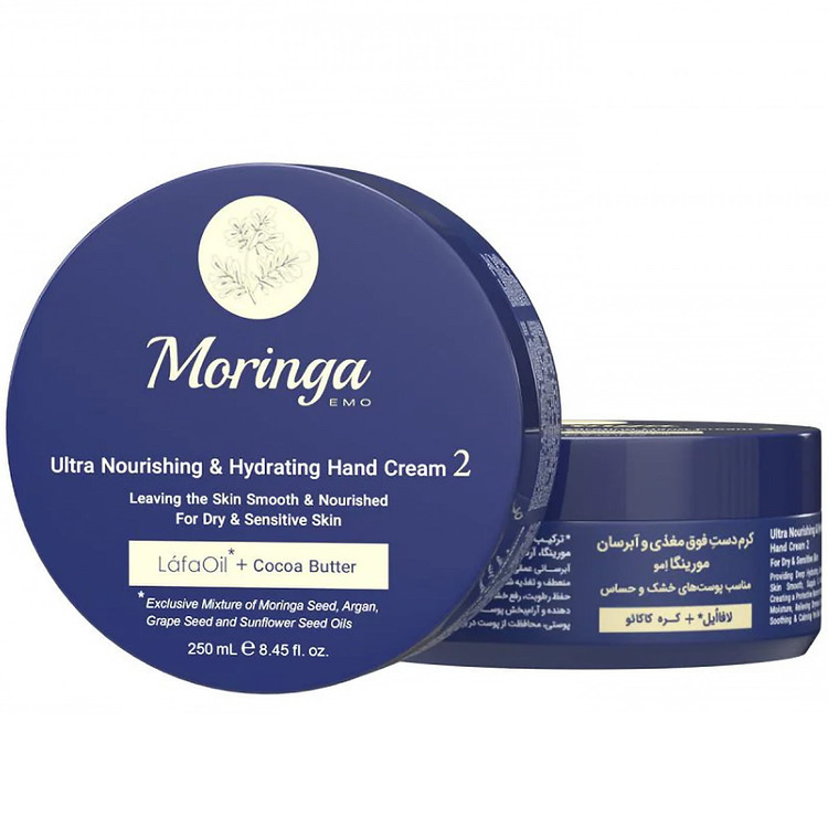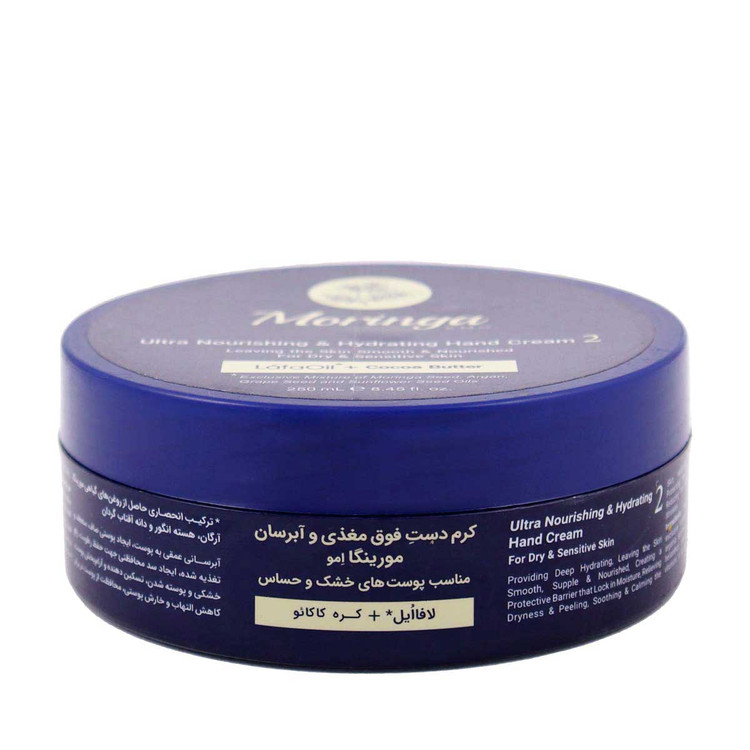 کرم دست و صورت آبرسان شماره 2 مورینگا حاوی لافااُیل و روغن رُزهیپ (میوه گل رز) و کاهای بوده، موجب آبرسانی عمیق پوست میشود و در تغذیه موثر آن نقش بسزایی دارد. لافااُیل ترکیبی انحصاری حاصل از روغنهای گیاهی مورینگا، آرگان، هسته انگور، دانه آفتابگردان و ویتامین A و E است، به حفظ رطوبت پوست کمک میکند و به واسطه خاصیت آنتی اکسیدانی به خوبی از پوست در برابر رادیکالهای آزاد، نور خورشید و آلودگیهای محیطی محافظت نموده و از پیری زودرس پوست جلوگیری به عمل میآورد. کرم آبرسان دست و صورت مورینگا با تامین مواد مغذی پوست در افزایش نرمی و لطافت آن موثر بوده و به رفع خشکی پوست کمک میکند. کرم آبرسان مورینگا به خاطر ترکیبات مفید و موثرش موجب تقویت پوست میشود و در بهبود خاصیت ارتجاعی پوست و افزایش استحکام آن تاثیرگذار است. یکی از مزایای کرم دست مورینگا کرولتی فری بودن آن است به شکلی که در فرآیند تولید آن به هیچ حیوانی آسیب وارد نمیشود. کرم مورینگا ضدالتهاب و التیام بخش است و به حفظ سلامت پوست و بهبود کیفیت آن کمک مینماید.