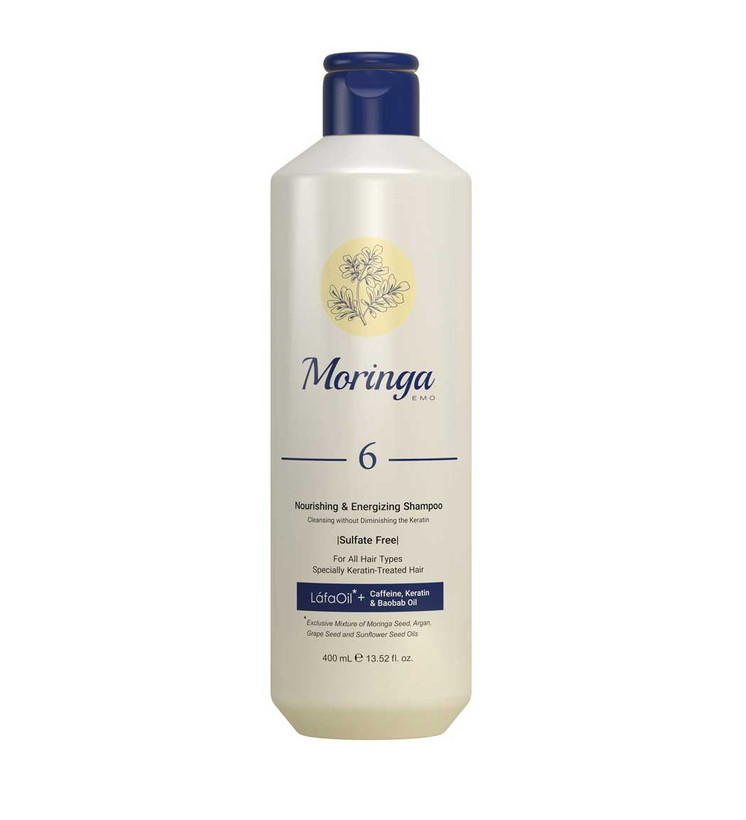 موهای کراتینه شده نیازمند مراقبت و رسیدگی ویژه و بیشتری بوده و باید از محصولات مراقبتی مخصوص با این نوع مو برای حفظ سلامت و شادابی آن و دوام بیشتر کراتینه مو استفاده شود. شویندههای مو فاقد سولفات مانع آسیب دیدن موها شده، بدون از بین بردن چربیهای طبیعی آن موها را به خوبی تمیز میکند و موجب حفظ رطوبت موها و جلوگیری از ایجاد موخوره میشود. شامپو بدون سولفات مخصوص موهای کراتینه شده مورینگا با قدرت پاک کنندگی مناسب خود به حفظ ساختار کراتین مو و جلوگیری از آسیب دیدن آن کمک کرده و در افزایش ماندگاری کراتینتراپی موثر است. شامپو مورینگا شماره 6 حاوی لافالویل، کراتین، کافئین و روغن بائوباب بوده، به تقویت فولیکولهای مو کمک میکند و در ترمیم و احیای تارهای مو و جلوگیری از ریزش آنها تاثیر مثبتی دارد. لافااویل ترکیبی انحصاری از روغن مورینگا، آرگان،روغن هسته انگور، روغن دانه آفتابگردان، ویتامینهای جوانساز و احیاکننده A و E بوده، خاصیت آنتی اکسیدانی دارد و به خوبی از موها در برابر رادیکالهای آزاد و عوامل مخرب محیطی مانند آلودگی هوا محافظت میکند. این محصول فاقد سولفات بوده، به افزایش درخشندگی موها کمک میکند و به خاطر فرمولاسیون موثر خود با رطوبت رسانی موها موجب تغذیه موثر آنها میشود. شامپو بدون سولفات مورینگا برای استحمام روزانه و افرادی که بوتاکس، اکستنشن و ریباند مو انجام دادهاند و یا دچار خشکی پوست سر و اگزما هستند نیز مناسب است. همچنین از ایجاد موخوره و آسیبهای ناشی از نور خورشید جلوگیری کرده و در بهبود گردش خون موضعی کف سر و افزایش نرمی و لطافت موها تاثیرگذار است.
