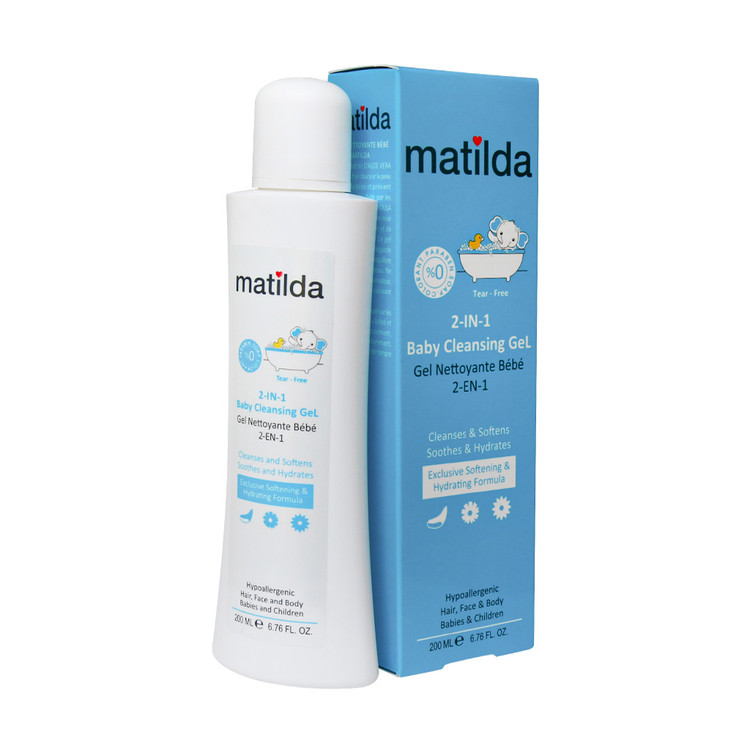 ژل پاک کننده دو در یک Matilda دارای خواص مرطوب کنندگی نیز است و باعث مرطوب نگه داشتن پوست کودک میشود و از خشکی پوست بعد از شستشو جلوگیری میکند. ترکیبات این محصول با دقت و اندازه مناسب طراحی شده تا پوست حساس کودک دچار آسیب نشود. پاک کننده ۲ در ۱ ماتیلدا هم برای پوست صورت و بدن و هم برای موهای کودک میتواند مورد استفاده قرار بگیرد. این محصول بدون صابون، پارابن و رنگ است.