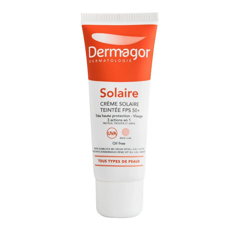 کرم ضد آفتاب SPF ۵۰+ رنگی فاقد چربی ۳ در ۱ درماگور مناسب پوستهای چرب و جوش دار بوده و دارای حداکثر حفاظت در برابر اشعه UVA و UVB را دارد. این ضد افتاب در یک رنگ فقط بژ تولید و پوشش مناسبی روی پوست ایجاد میکند. در ترکیبات این محصول گلوکونات روی که یک آنتی باکتریال و تنظیم کننده ترشح چربی و ریشه Arctium Lappa به عنوان ضد التهاب و تنظیم کننده ترشح چربی قرار دارد
